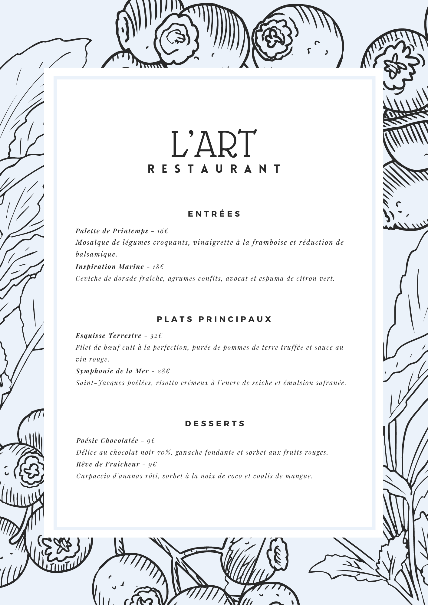 Dans notre menu, chaque plat est une composition culinaire, soigneusement orchestrée pour éveiller vos papilles et nourrir votre âme au Gastronomique Artistique.