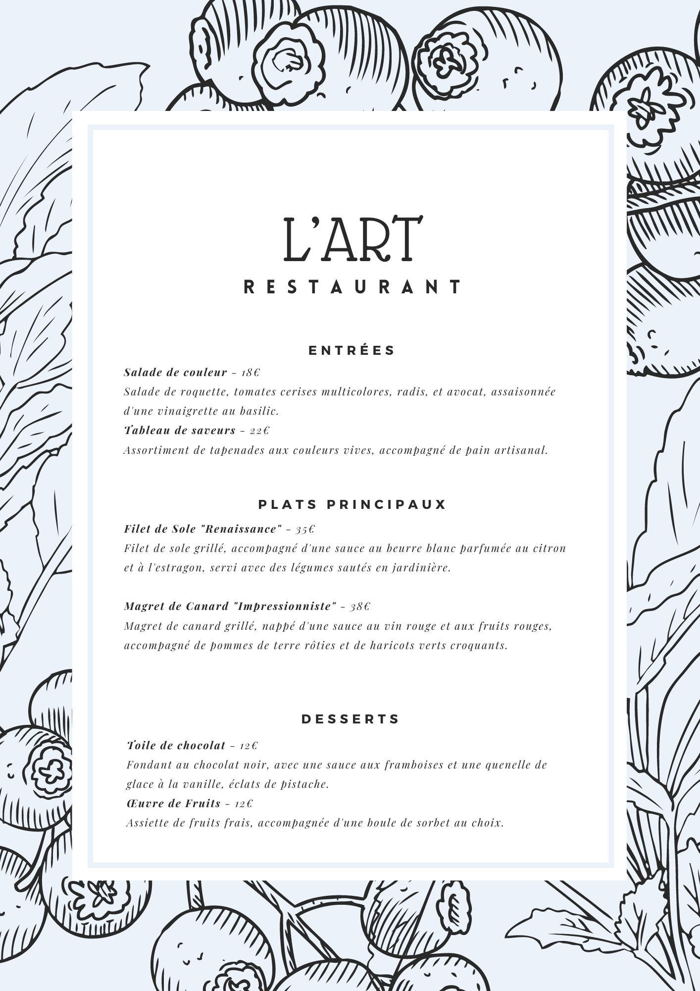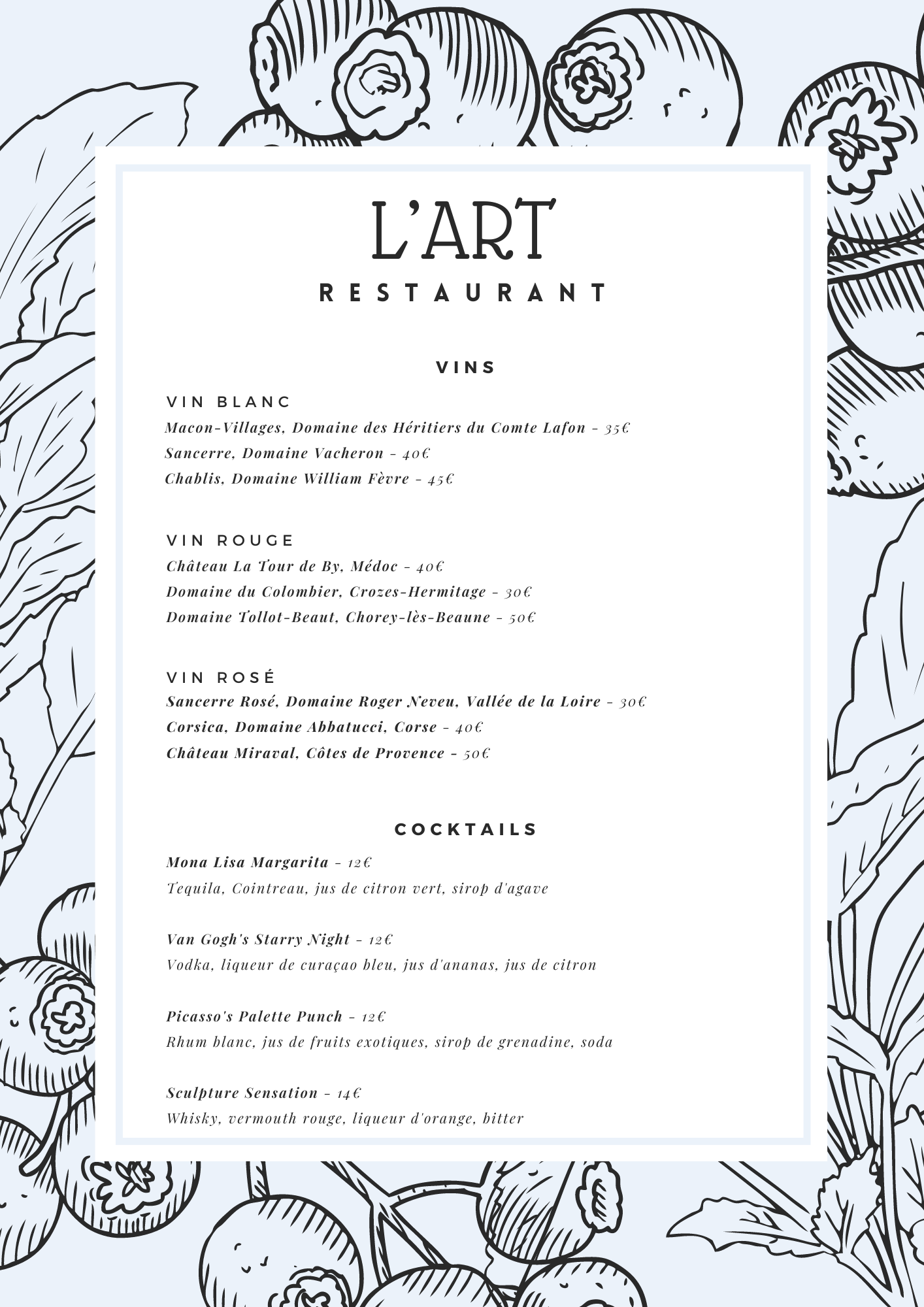 Chez l’Art Restaurant, chaque plat est une toile vierge sur laquelle nos chefs talentueux créent des chefs-d’œuvre culinaires. Inspirés par la passion des arts visuels, nous considérons la cuisine comme une forme d’expression artistique. Chaque ingrédient est soigneusement sélectionné pour sa qualité et sa fraîcheur, et chaque plat est méticuleusement conçu pour évoquer des émotions et des sensations uniques chez nos convives. Nous croyons que manger devrait être une expérience multisensorielle, où les saveurs, les textures et les présentations se marient pour créer une symphonie gustative inoubliable. Rejoignez-nous pour une aventure gastronomique où la nourriture transcende le simple acte de manger pour devenir une véritable expérience artistique.